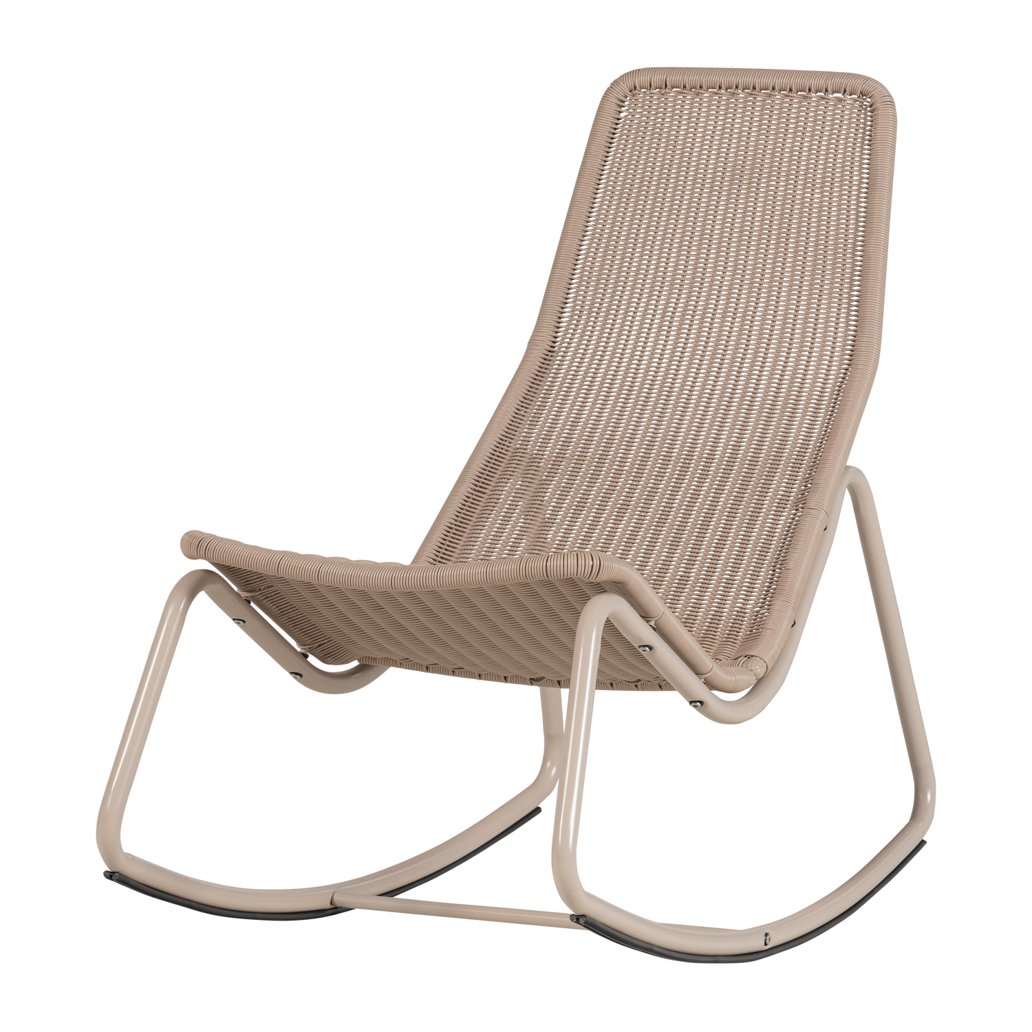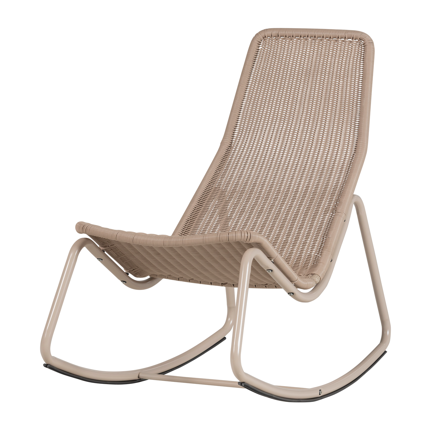 De Tom schommelstoel is een relaxte stoel voor binnen en buiten. Tom komt uit de collectie van het Nederlandse merk WOOOD en is gemaakt van kunststof rotan met een zandkleurige coating. Tom is geschikt voor binnen- en buitengebruik doordat er een beschermende coating over de stoel heen zit. Hierdoor is het materiaal geschikt voor alle weersomstandigheden. Het zandkleurige metalen frame heeft een matte uitstraling en een verstevigende tussenlat.