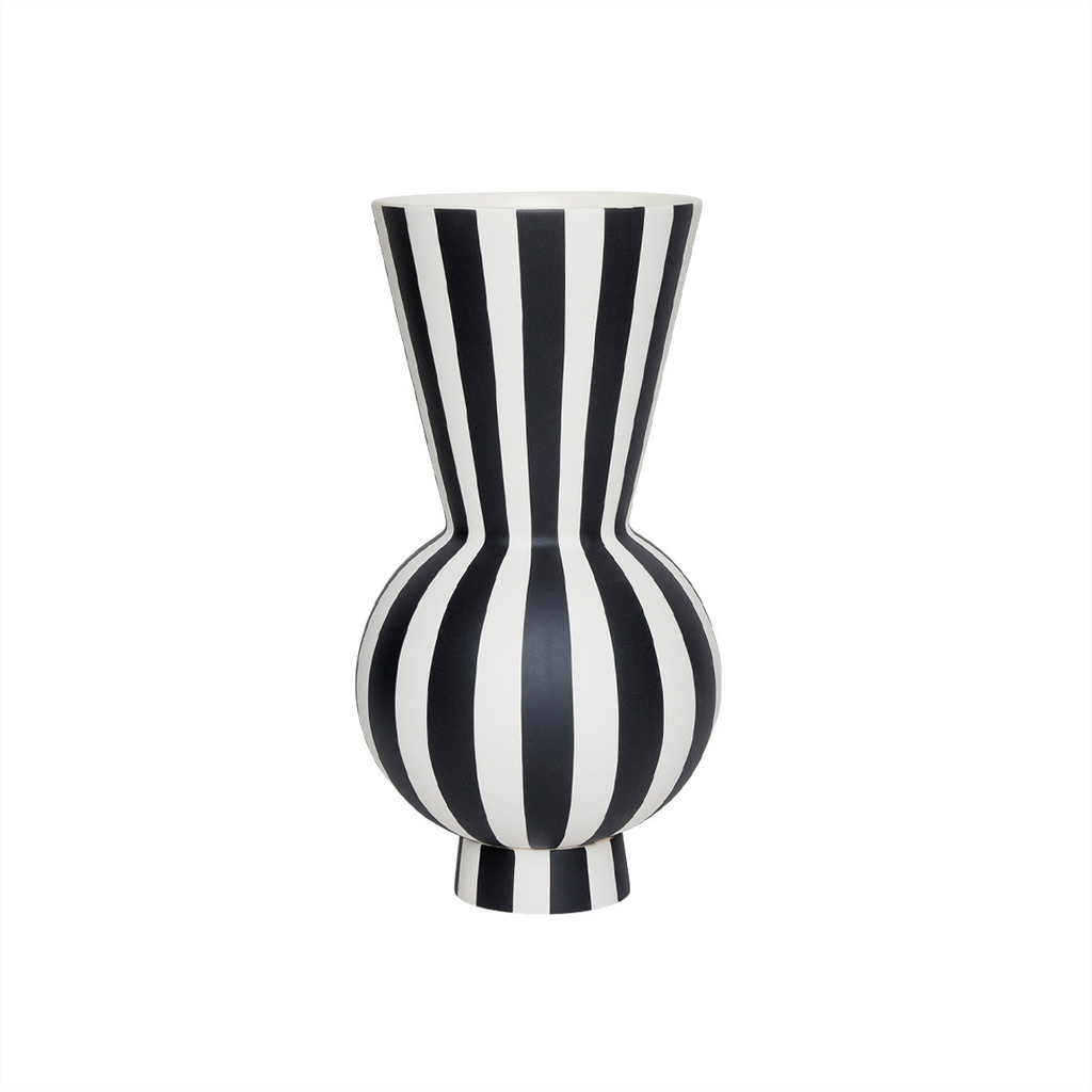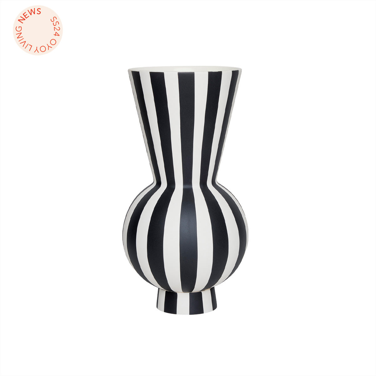 De Toppu Ronde Vaas is een geliefde toevoeging aan de Toppu Family en een klassieker van OYOY. Handgemaakt met precisie, schildert een team van zeer bekwame vrouwen iedere streep op delicate wijze, om hun expertise te tonen. Hetzelfde toegewijde team vervaardigt alle Toppu items, wat zorgt voor consistentie in vakmanschap. Het doordachte ontwerp van de vaas voegt niet alleen elegantie toe, maar zorgt er ook voor dat bloemen prachtig staan, waardoor het een perfecte combinatie van vorm en functie is.