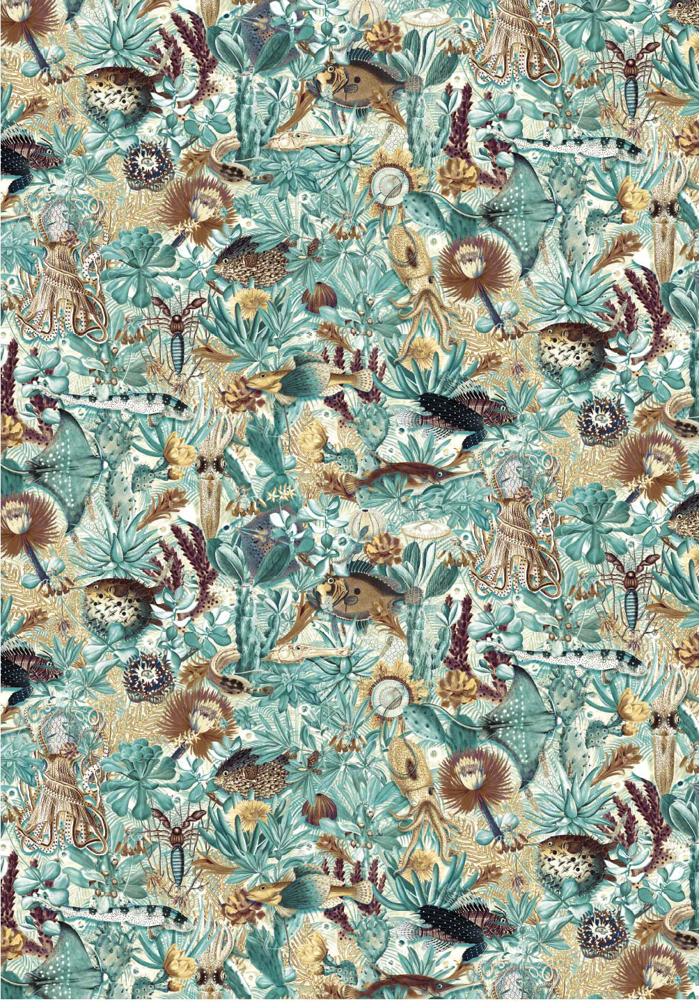 Dit behang is speciaal ontworpen voor mensen met interieurlef. De meest prachtige vissen en andere exotische waterdieren stelen hier de show. Door een uitgekiende mix van illustraties en bijzonder kleurgebruik ontstaat een levendige behangwand.