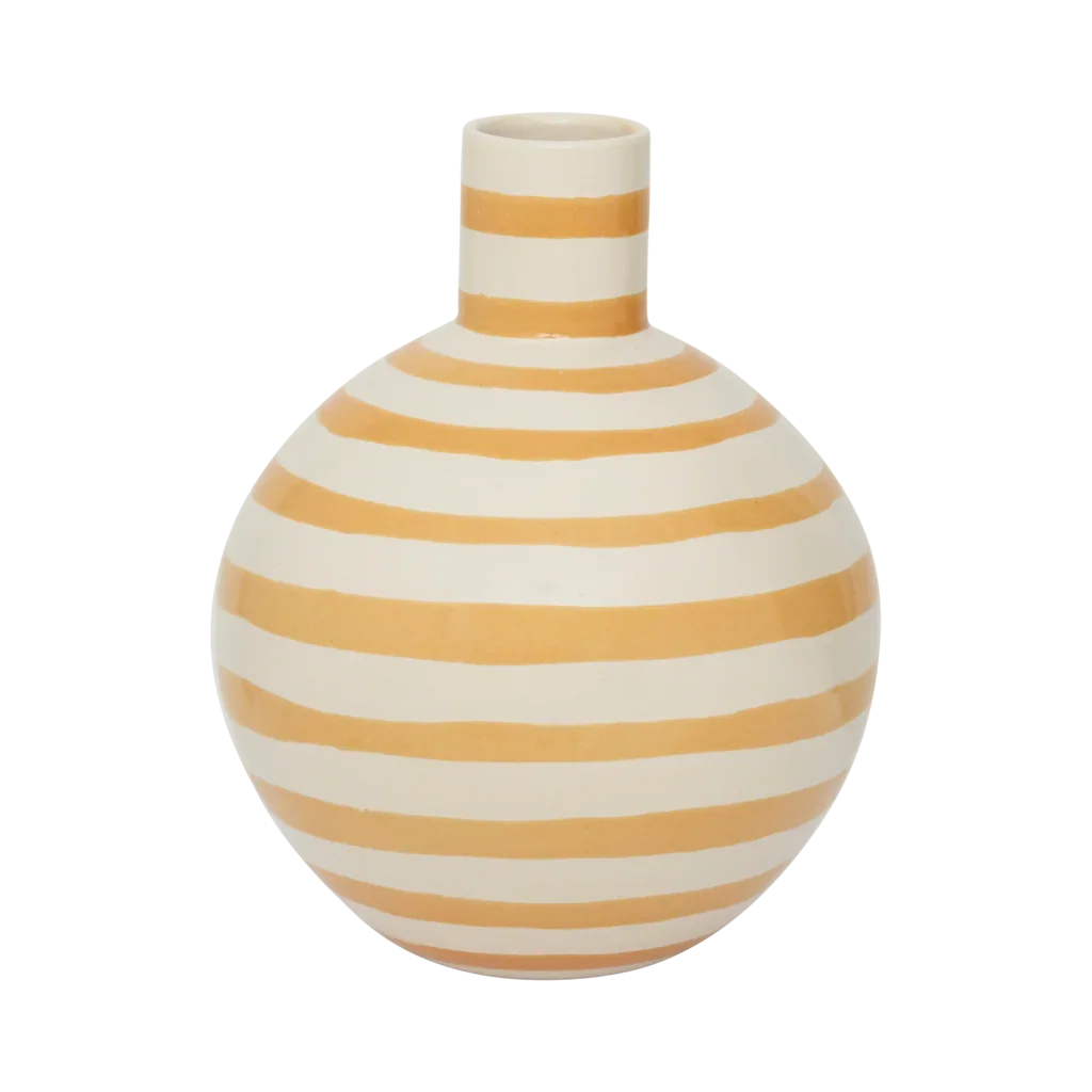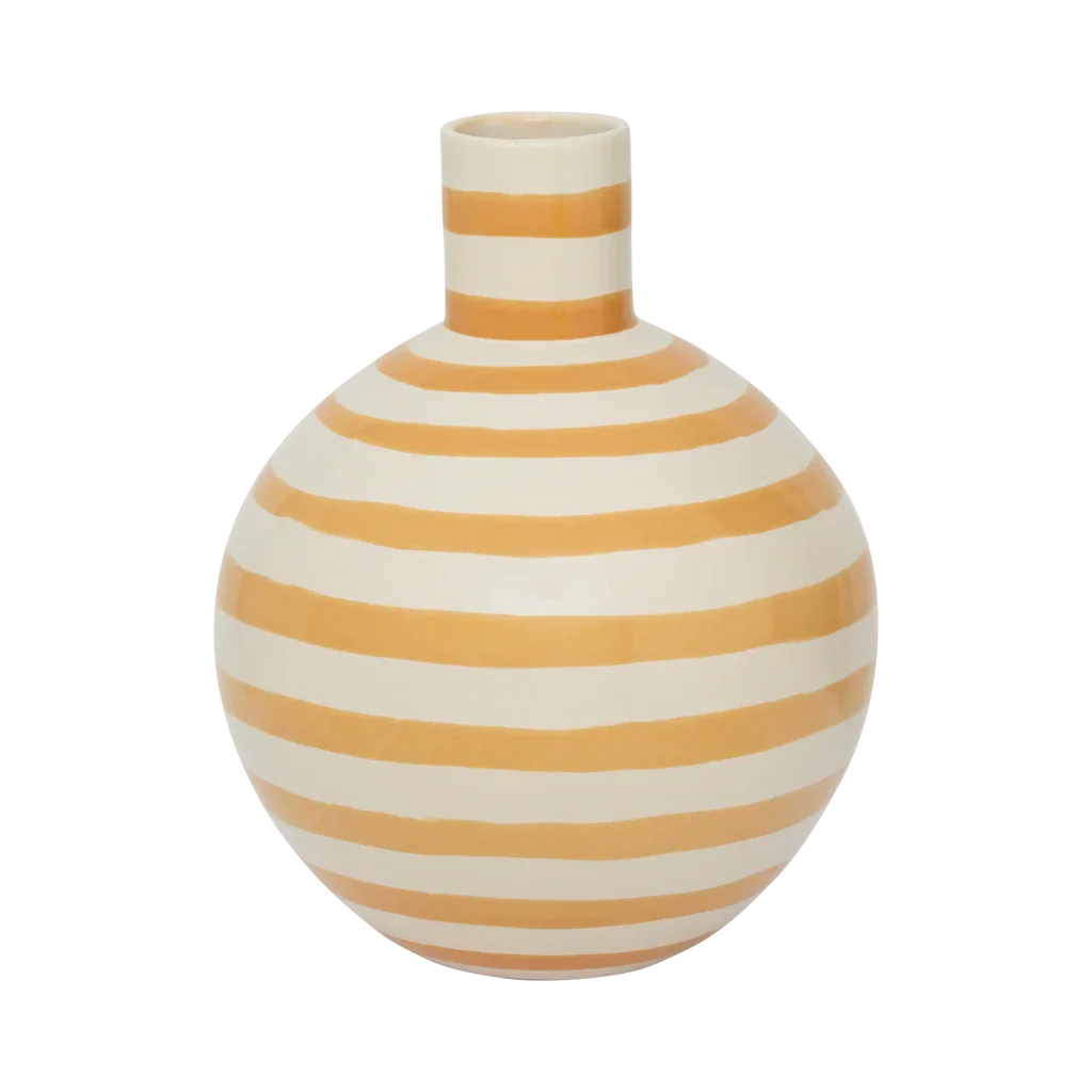 Deze bloemvaas in een zachte popcornkleur trekt meteen de aandacht met haar dansende goud-oranje strepen. Vervaardigd uit een mix van gerecycled en nieuw keramiek brengt deze vaas duurzaamheid en stijl moeiteloos samen.