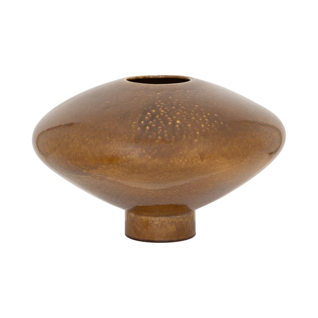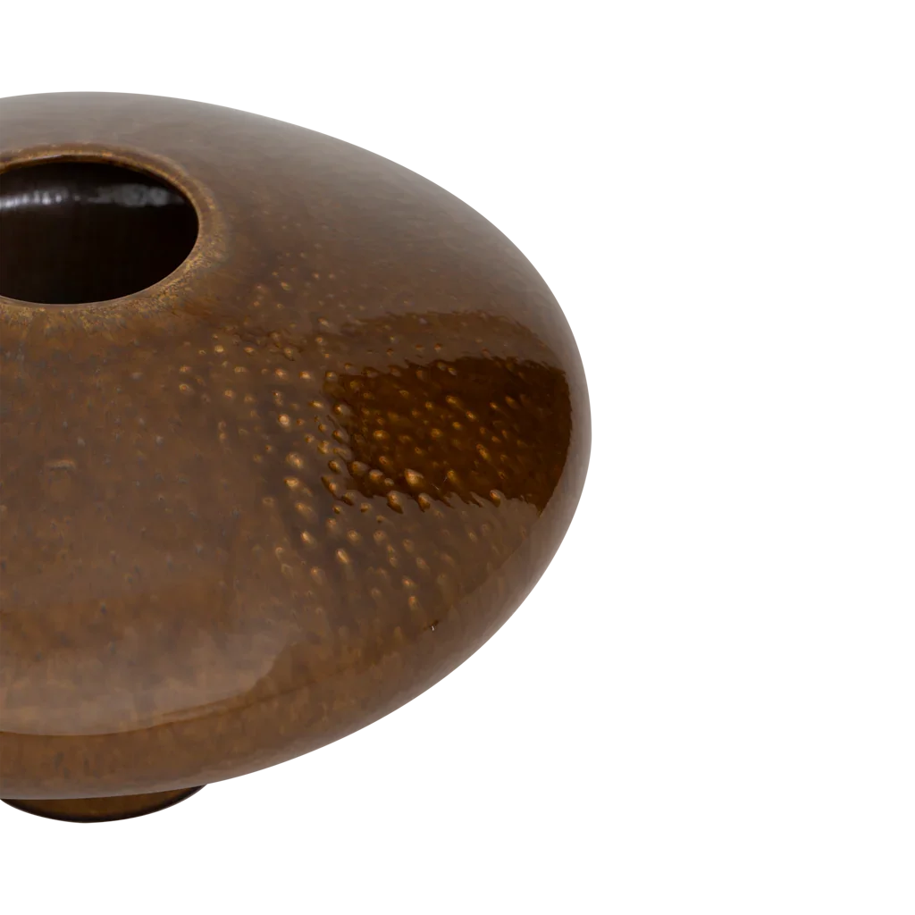 Deze vaas van keramiek in een glanzende golden brown, met de hand gemaakt in Portugal, brengt een warme, sculpturale energie in je interieur. Het krachtig gevormde silhouet maakt het een opvallend middelpunt - een stijlvolle blikvanger die sfeer en karakter toevoegt aan elke ruimte.