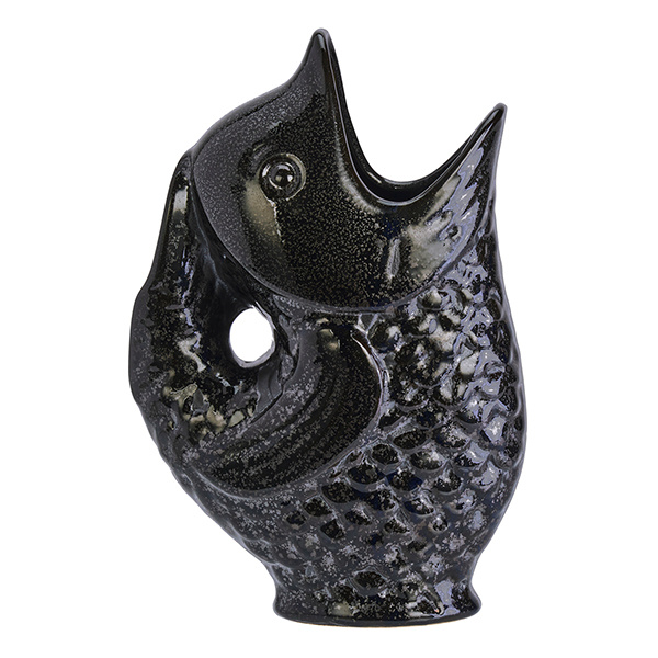Deze zwarte stoneware vaas heeft een krachtige, minimalistische uitstraling. Het glanzende zwarte glazuur en de speelse visvorm zorgen voor een spannend contrast. Zowel functioneel als decoratief: een opvallende keuze op tafel, in een kast of op de vloer.