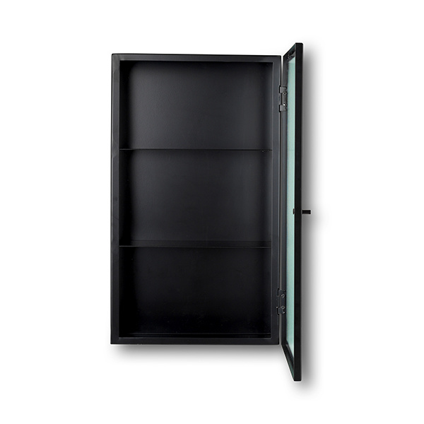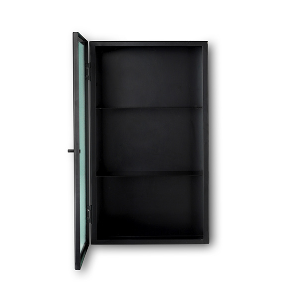 Het zwart gepoedercoate stalen frame is nu verkrijgbaar met elegante glazen panelen en deuren van draadglas, en is de ideale oplossing voor het opbergen van glazen in de keuken of beauty essentials in de badkamer.