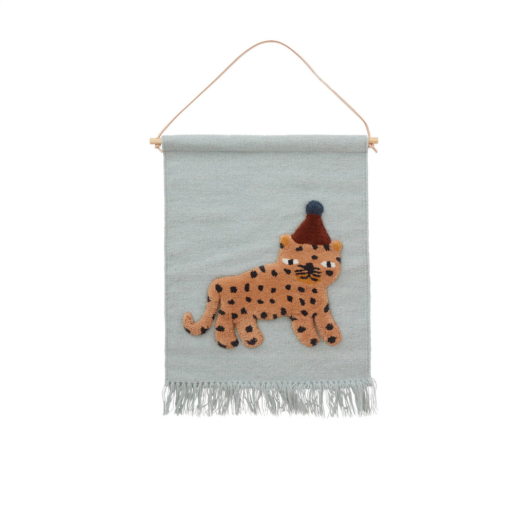 De serie wandtapijten is een leuke en speelse manier om de kinderkamer te decoreren. Het luipaard heeft een dimensionaal effect dat leuk en uitdagend kan zijn voor de tactiliteit van het kind. Het vloerkleed is handgemaakt van wol/katoen en kan aan de muur worden gehangen met de bijgeleverde stok en leren koord.