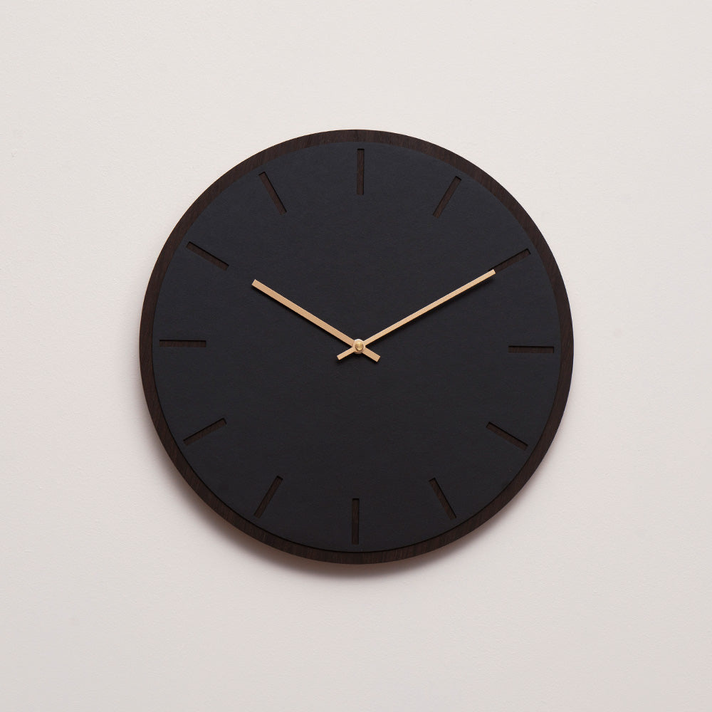 Vægurets minimalistiske design får et meget roligt udtryk med en baggrund af mørk egetræsfiner, belagt med sort linoleum. Træet giver varme til det sorte linoleum med udskårne timeindikatorer, og den runde skive får karakter, alt efter hvilke visere du vælger at sætte til.
