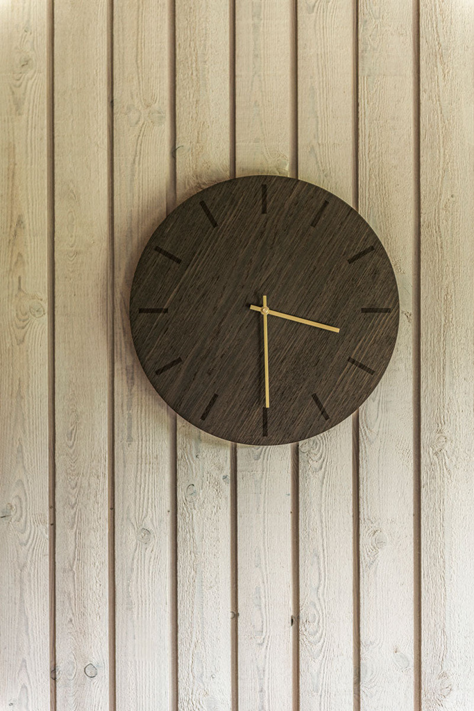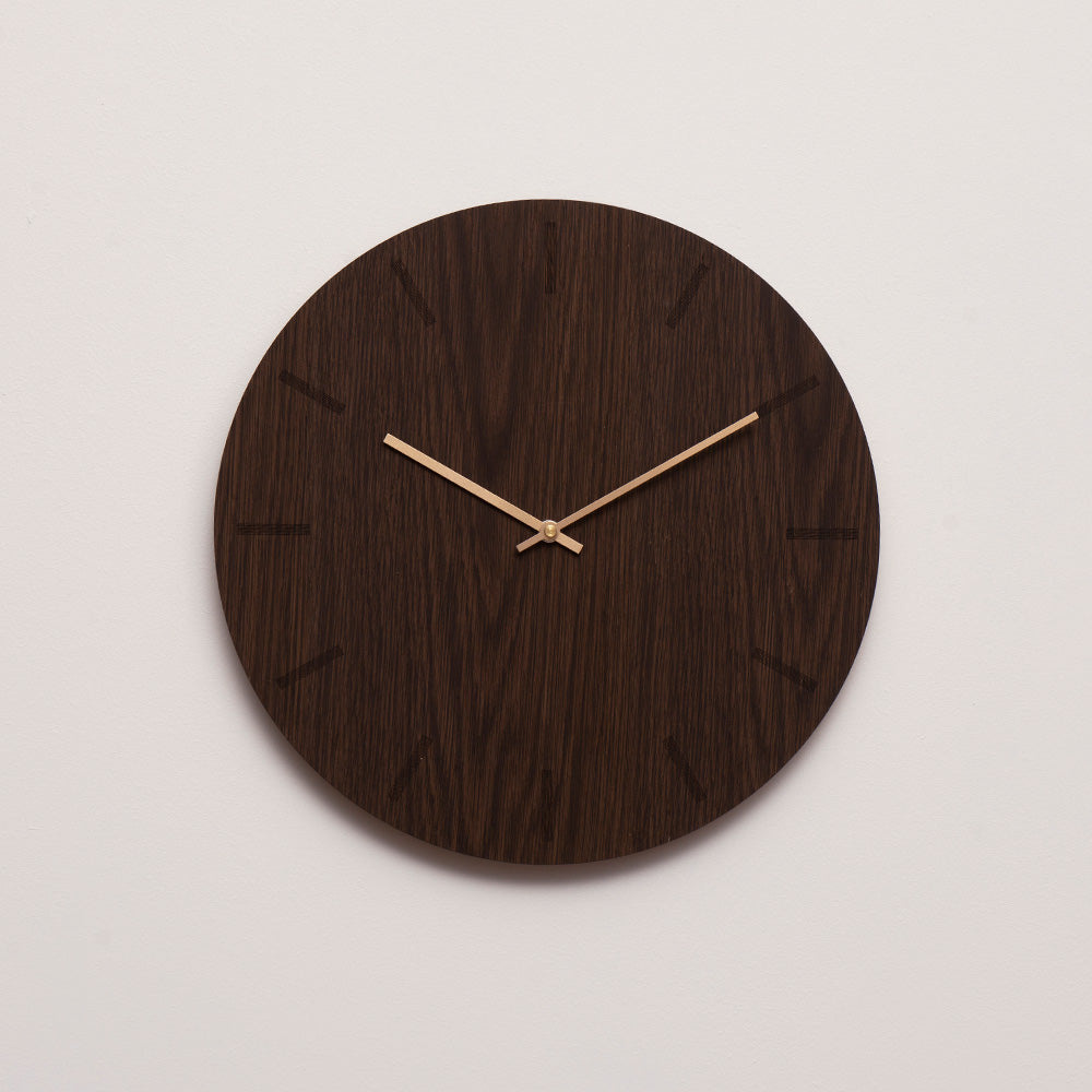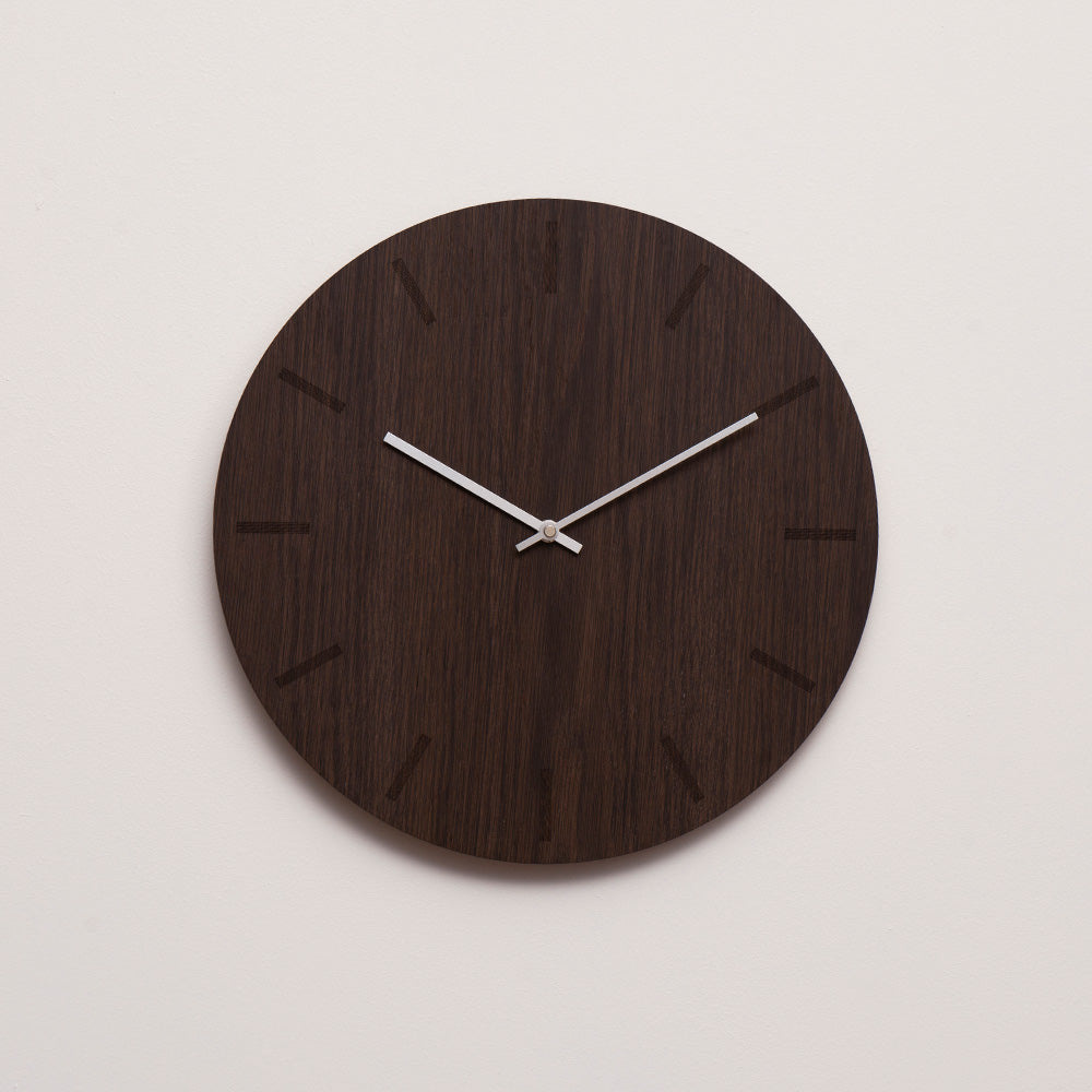 Een mooie en eenvoudige wandklok met een ronde schijf, gesneden uit donker eikenhout. De jaartallen zijn duidelijk zichtbaar en variëren van horloge tot horloge, waardoor ieder exemplaar geheel uniek is. Het donkere hout van de klok past mooi in elk modern Scandinavisch huis en geeft karakter aan de muur. Je kunt kiezen welke kleur handen je wilt combineren met het donkere hout, afhankelijk van hoezeer ze willen domineren.