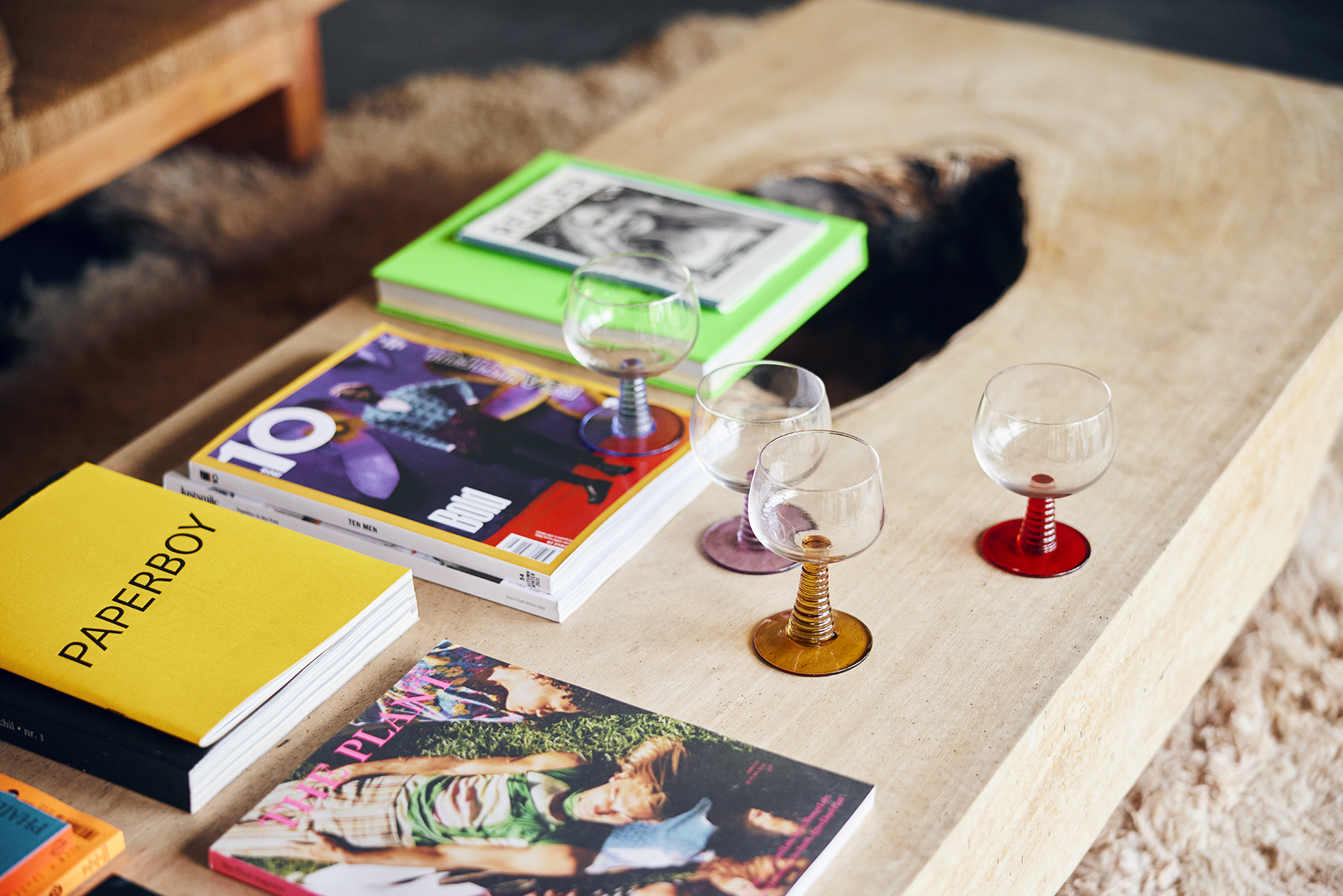 Handgeblazen low swirl wijnglas met een massief roodgekleurde glazen voet. Valt direct op en geeft het glas een speelse uitstraling. Zo geniet je nog meer van je wijn of een ander drankje.